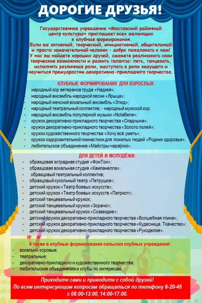 Мостовский районный центр культуры приглашает всех желающих в клубные формирования!