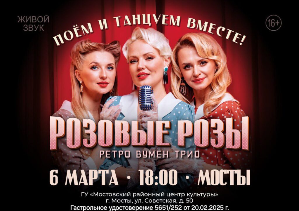 Мостовский районный центр культуры приглашает на концерт «Поём и танцуем вместе!» Ретро Вумен Трио «Розовые розы»