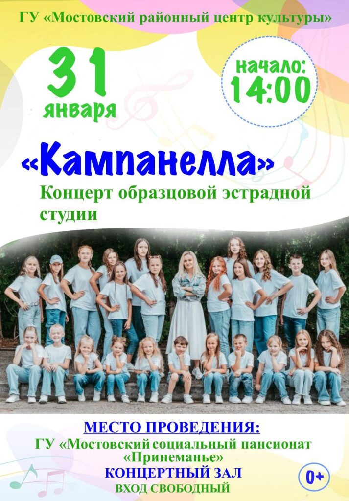 Приглашаем вас на концерт образцовой эстрадной студии «КАМПАНЕЛЛА», который состоится в Мостовском социальном пансионате «Принеманье»