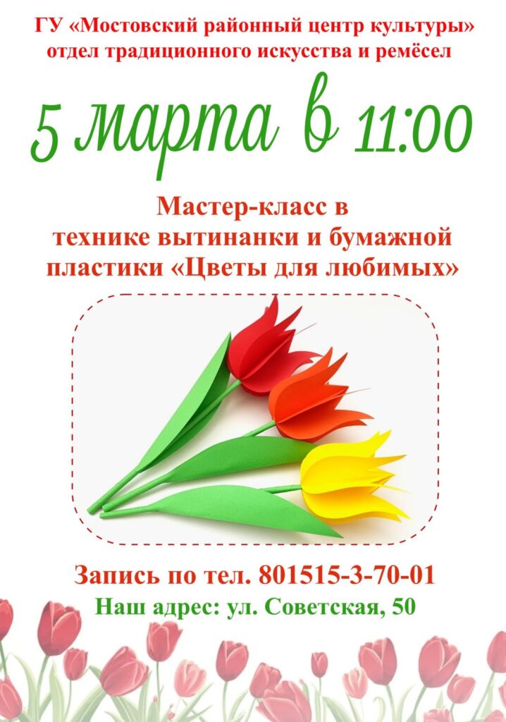 5 сакавіка аддзел традыцыйнага мастацтва і рамёстваў запрашае на  майстар-клас ў тэхніцы выцінанкі і папяровай пластыкі “Кветкі для каханых”. Пачатак у 11.00 гадзін. 🎶Запрашаем усіх жадаючых прыняць удзел у мерапрыемстве!