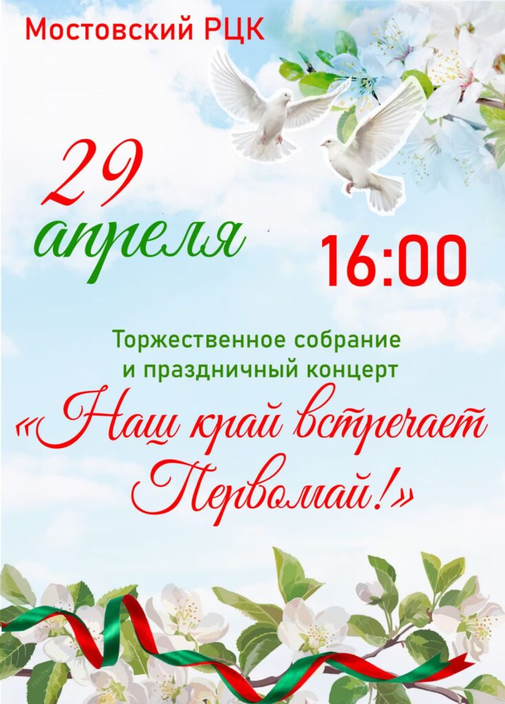 Мостовский районный центр культуры приглашает на торжественное собрание и праздничный концерт «Наш край встречает Первомай!» ко Дню труда.