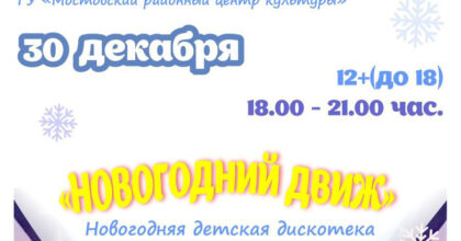 Дата: 30 декабря Время: 18:00 — 21:00 Где: Мостовский РЦК Цена: 5 руб. Не забудьте… Подробнее »Приглашаем вас на новогоднюю дискотеку для молодёжи «Новогодний движ»!